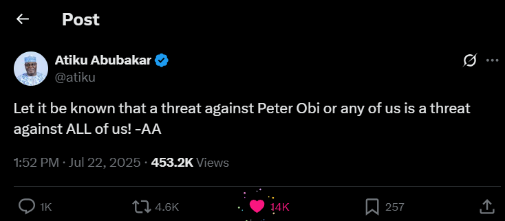 The governor’s remarks triggered backlash, including from Atiku, who tweeted, “Let it be known that a threat against Peter Obi or any of us is a threat against ALL of us!”
