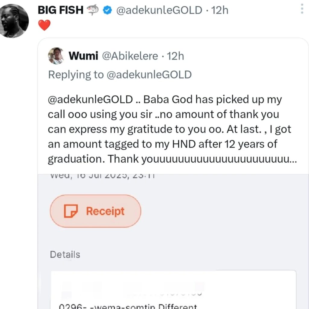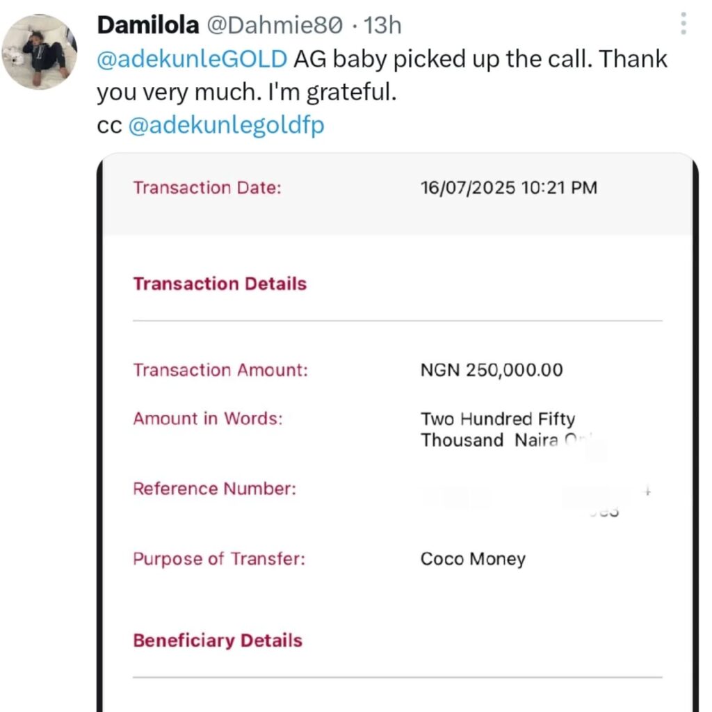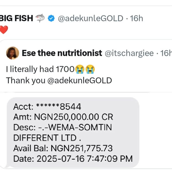 A few hours later, Adekunle Gold followed up with: “Check your DM, you might have been picked.” Soon after, recipients of the ₦250,000 could not hold their joy, as they began sharing screenshots of credit alerts.