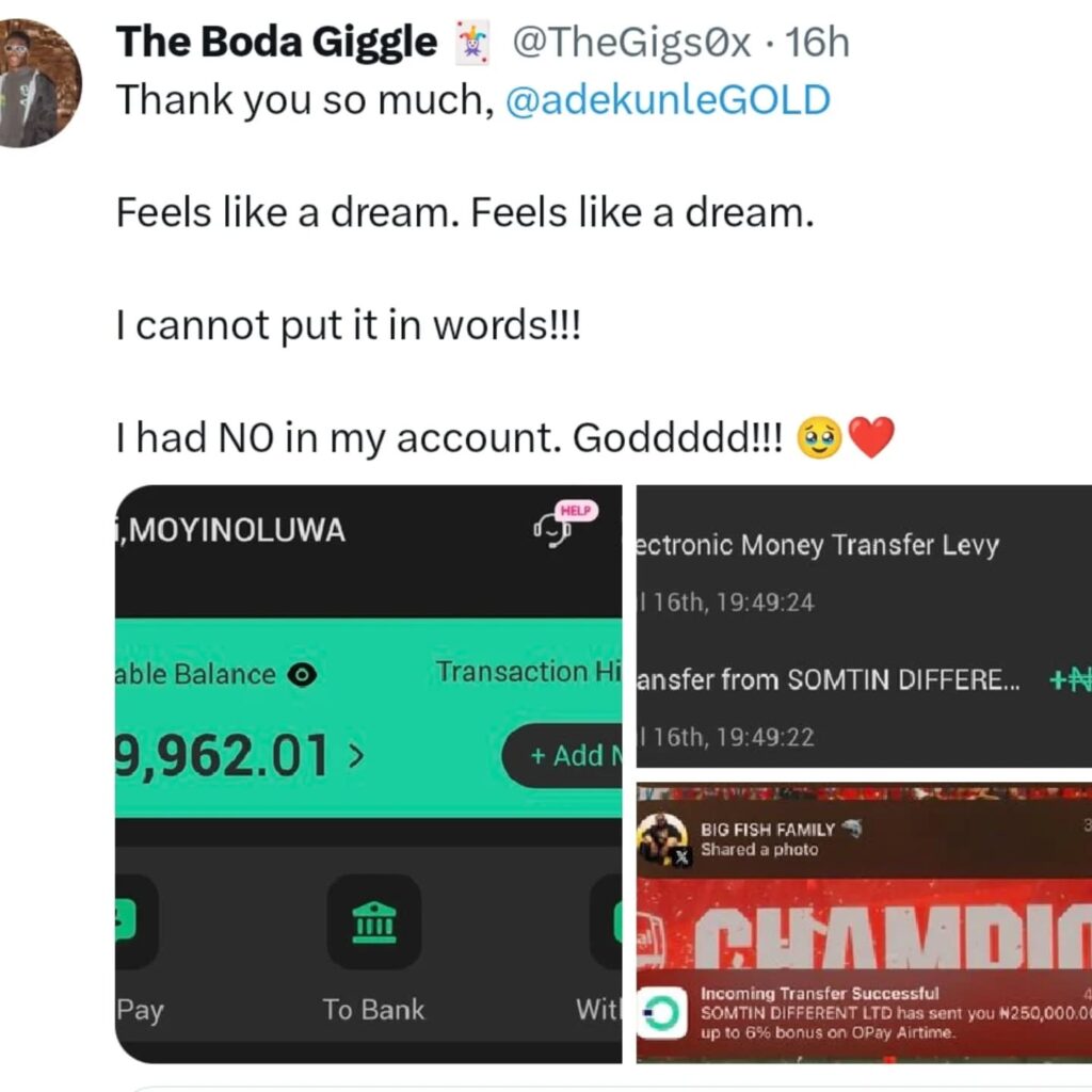 One of the recipients The Boda Giggle, who shared a screenshot of his new account balance after receiving ₦250,000 Adekunle Gold overwhelmed with gratitude wrote, “I had N0 in my account. Goddddd!!!”