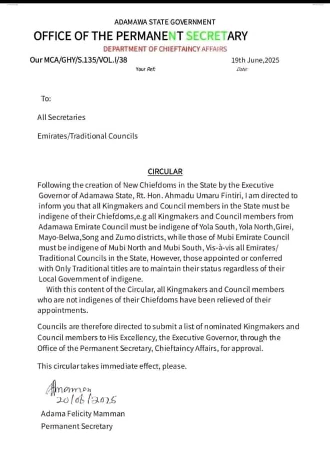 The circular, signed by Mrs. Adama Felicity Mamman, Permanent Secretary of the Department of Chieftaincy Affairs, stated that all Kingmakers and Council members must now be indigenes of their respective chiefdoms. By this directive, Atiku, who hails from Jada in the Ganye Chiefdom, is disqualified from holding a title under the Adamawa Emirate Council.