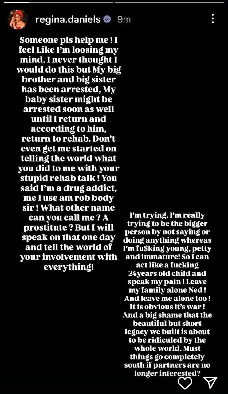 Actress Regina Daniels took to her Instagram story to issue a distressing appeal for help, as her marital troubles with husband Prince Ned Nwoko appear to intensify.