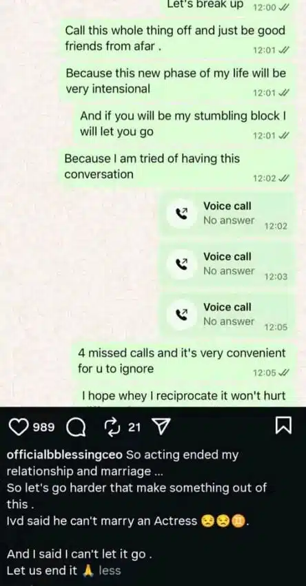 Blessing made the announcement via her Instagram page, stating that she was ending both the relationship and their content collaborations. She also revealed plans to sell or give away her engagement ring.
