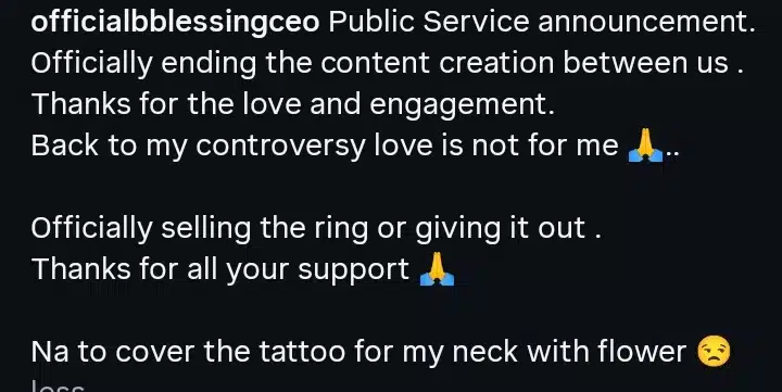 “Public Service Announcement. Officially ending the content creation between us. Thanks for the love and engagement. Back to my controversy—love is not for me,” she wrote. “Officially selling the ring or giving it out. Thanks for all your support. Na to cover the tattoo for my neck with flower.”