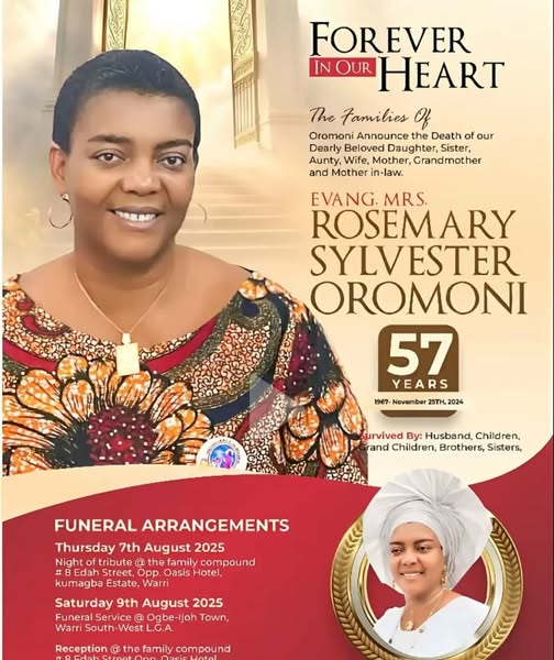 Mrs. Rosemary Oromoni’s funeral will include a night of tribute on 7 August, with the burial ceremony scheduled for 9 August at their Kumagbe Estate home, followed by reception festivities.