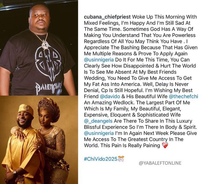 “Sometimes, God has a way of reminding you that you are powerless, no matter what you think you have,” he wrote. Addressing the U.S. Embassy in Nigeria, he pleaded for another chance: “You can clearly see how disappointed and hurt the world is to see me absent at my best friend’s wedding. Delay is never denial — CP is still hopeful.”