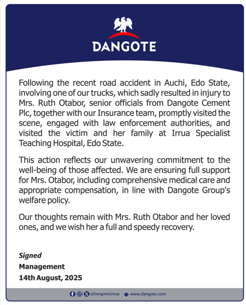 “This action reflects our unwavering commitment to the well-being of those affected. We are ensuring full support for Ms. Ruth, including comprehensive medical care and appropriate compensation, in line with Dangote Group’s welfare policy,” the statement read.