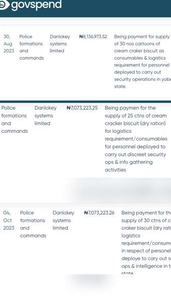 Fresh details from Nigeria’s public payments portal, Govspend, have raised questions about the spending patterns of the Nigeria Police Force, showing that over N22 million was spent on cartons of cream cracker biscuits for personnel on operations, according to a report by SaharaReporters.