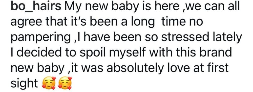 “My new baby is here, we can all agree that it’s been a long time no pampering, I have been so stressed lately I decided to spoil myself with this brand new baby, it was absolutely love at first sight,” she wrote.
