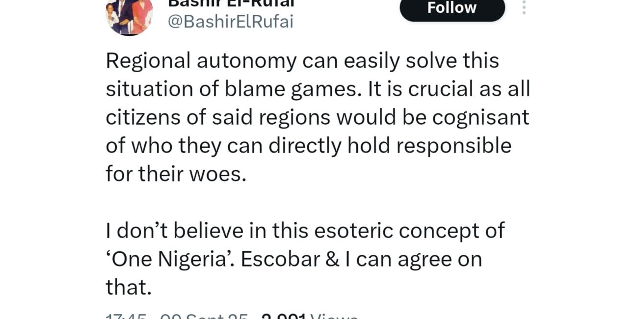Bashir El-Rufai, son of former Kaduna State Governor Nasir El-Rufai, has dismissed the concept of “One Nigeria,” arguing instead for regional autonomy as the only sustainable path to national stability.