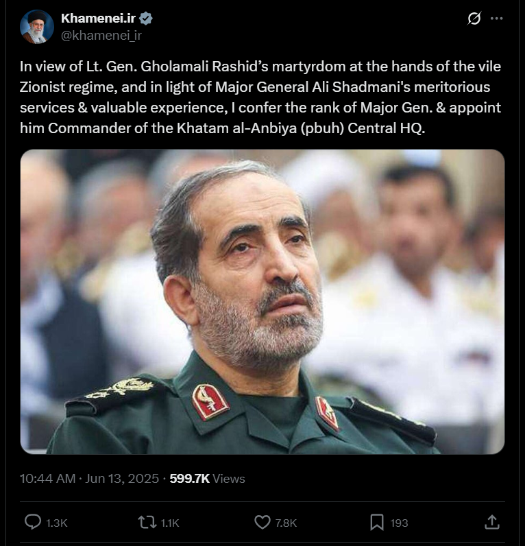 “In view of Lt‑Gen. Gholamali Rashid’s martyrdom at the hands of the vile Zionist regime… I confer the rank of Major Gen. and appoint him Commander of the Khatam al‑Anbiya Central HQ,” Khamenei declared, replacing Rashid with Major Gen. Ali Shadmani.