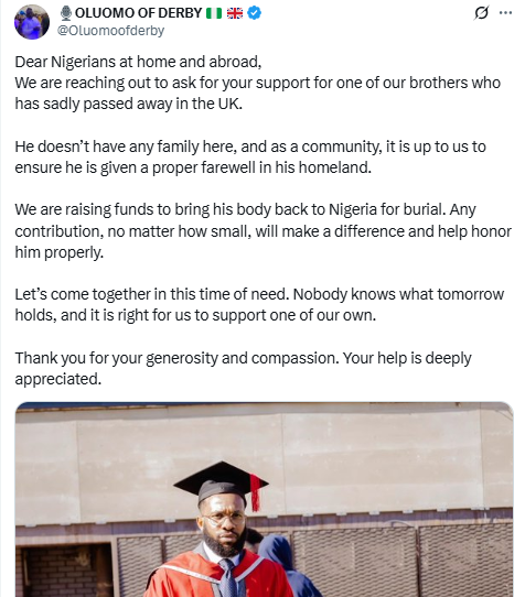 Friends and well-wishers have since launched a fundraising campaign to help repatriate his remains to Nigeria for burial, describing him as a bright, kind, and ambitious young man whose life was cut short too soon.