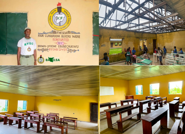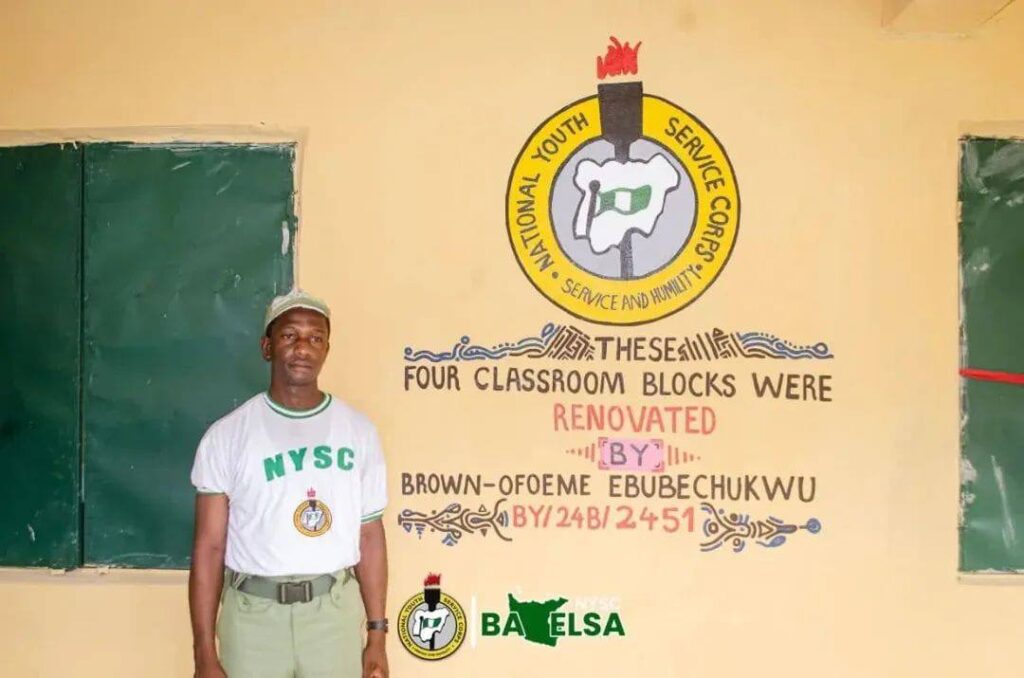 A National Youth Service Corps (NYSC) member, Brown-Ofoeme Ebubechukwu Prosper (BY/24B/2451), has brought new life to a public primary school in Bayelsa State after witnessing pupils studying under the rain in dilapidated classrooms.