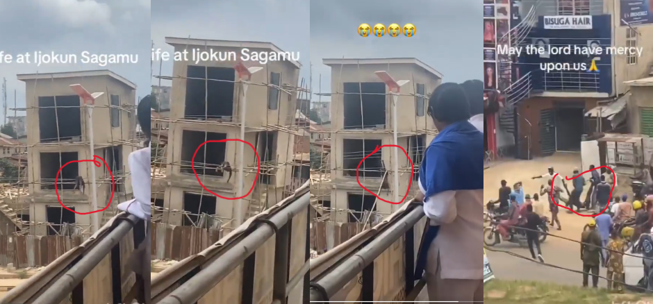 A tragic video has emerged of a man hanging and struggling for life on electric wires connected to street poles at Ijokun, Sagamu, Ogun State.