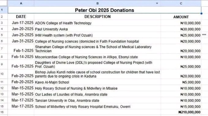 So far, Peter Obi has donated approximately ₦530,000,000 to schools and hospitals from January to July 2025. Below is a breakdown of Obi’s interventions across Nigerian institutions from January to March.