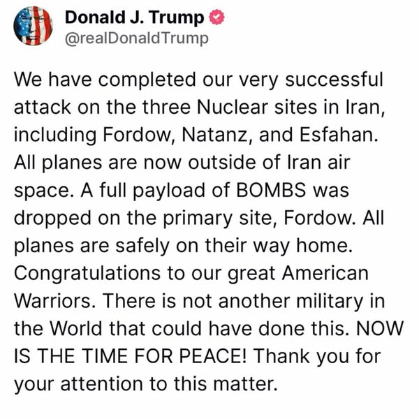 “We have completed our very successful attack on the three Nuclear sites in Iran, including Fordow, Natanz, and Esfahan. All planes are now outside of Iran air space. A full payload of BOMBS was dropped on the primary site, Fordow. All planes are safely on their way home,” Trump wrote. He went on to praise the U.S. military: “Congratulations to our great American Warriors. There is not another military in the World that could have done this. NOW IS THE TIME FOR PEACE!”