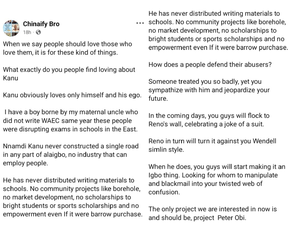 Chibuikem Akudo-Kamma Doncartymore wrote; “…I became worried about his sincerity when he commanded those loyal to him to boycott election all over Alaigbo in 2015, PVC registration was shunned by many Igbo people, then few days to the election, he asked same people (Igbos) to no longer boycott election but vote for Atiku/Obi, that was when I gave up completely about his sincerity.